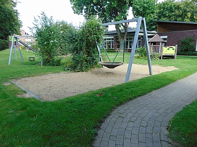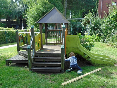 Für ausreichend Bewegung an der frischen Luft wird das großzügige Außengelände rund um den Kindergarten genutzt. Die Kinder spielen auf dem Spielplatz, kicken auf dem Fußballfeld, bauen und buddeln im Sandkasten, matschen mit der Wassrpumpe, nutzen die zahlreichen verschiedenen Fahrzeuge und vieles mehr.
