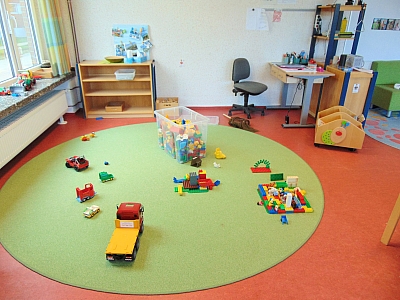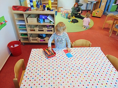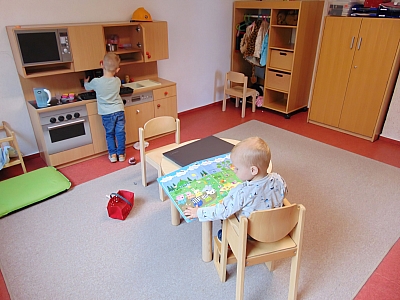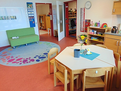 Die Puppenecke mit Küchenzeile und Rollenspielgarderobe fördert das soziale Lernen und das kreative Rollenspiel. Auf dem Bauteppich entstehen fantasievolle Bauwerke, der Konstruktionsteppich regt technisches Denken an. Für ruhigere Beschäftigungen gibt es einen Spielteppich mit Legematerialien und Puzzeln sowie eine Leseecke mit Bilder- und Vorlesebüchern. Die frei zugängliche Mal- und Bastelecke lädt zum kreativen Gestalten ein.