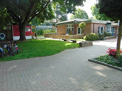 Unsere Einrichtung verfügt über ein großes Außengelände, das den gesamten Kindergarten umgibt. Hier können die Kinder mit verschiedenen Fahrzeugen um das Gebäude herumfahren. Zudem bieten wir im Außenbereich vielfältige Rückzugs- und Spielmöglichkeiten wie verschiedene Schaukeln, ein Spielhaus, eine neue Slackline und mehr. Auf dem Spielplatz befindet sich außerdem ein Bauwagen, der den angehenden Schulkindern als besonderer Spielbereich dient. Für die Nestgruppe gibt es auf dem Außengelände einen abgezäunten Spielbereich, der über die Gruppentür direkt zugänglich ist und den Jüngsten ungestörtes Spielen ermöglicht.